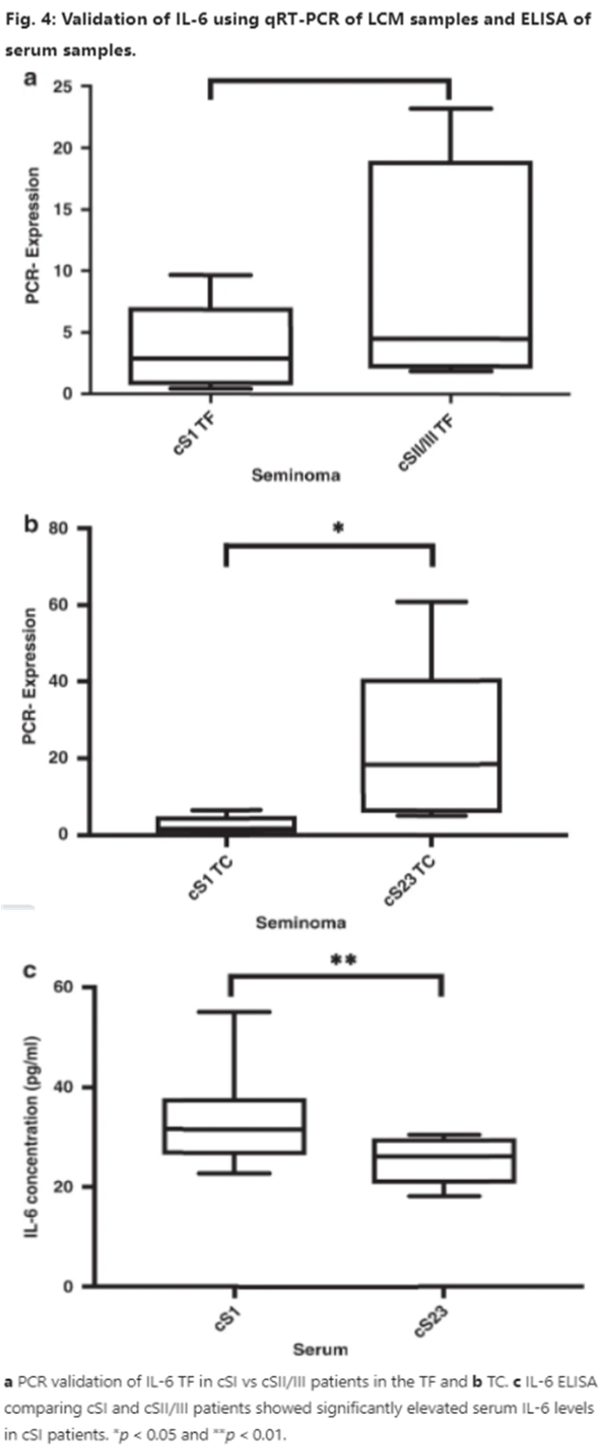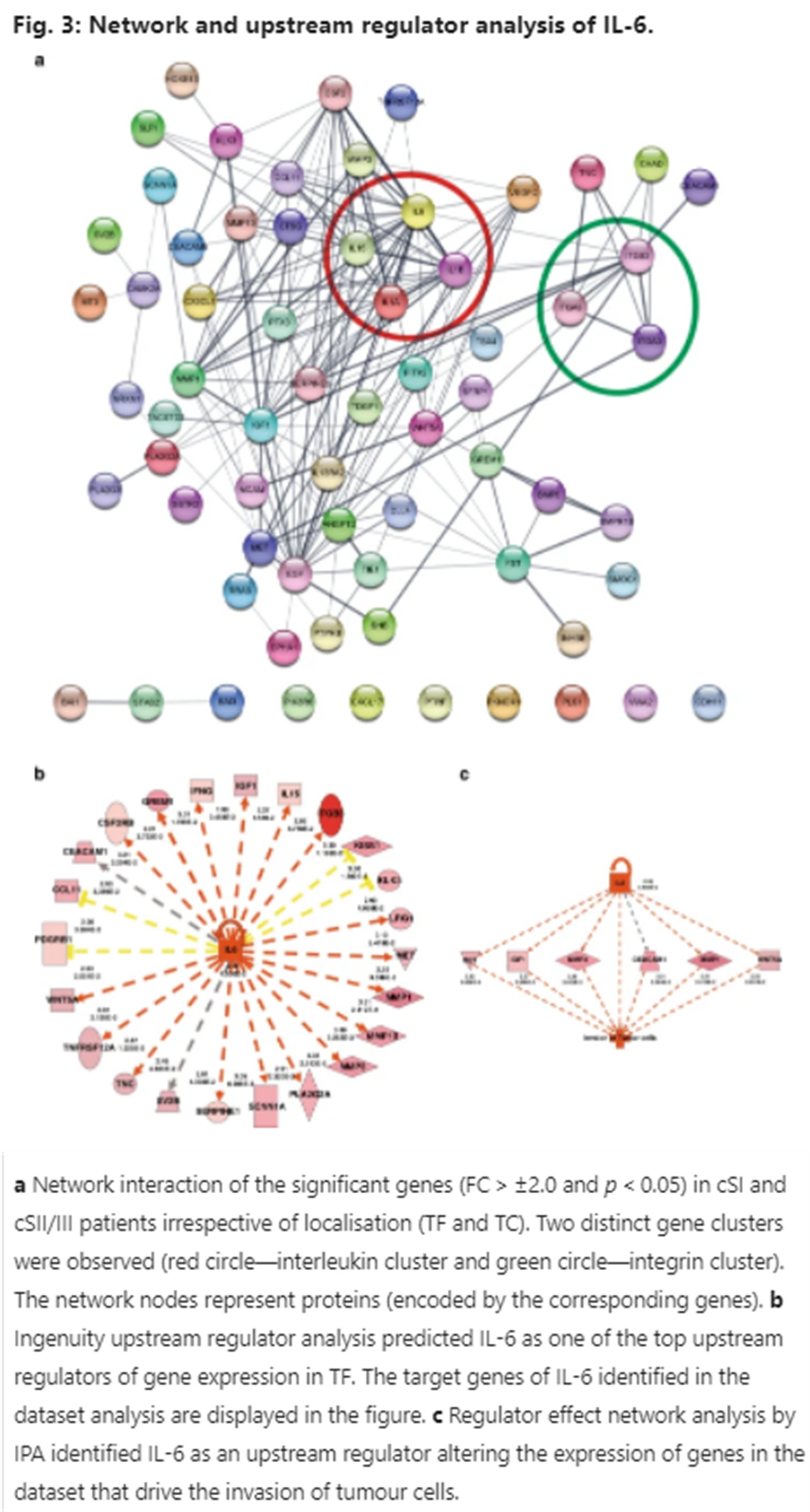 使用激光捕獲顯微切割分別收集非轉(zhuǎn)移性(監(jiān)測和無復(fù)發(fā)隨訪>2年)和轉(zhuǎn)移性STGCT的定義區(qū)域見圖一[侵襲性腫瘤前沿(TF)和腫瘤中心(TC]。使用nCounter技術(shù)分析與腫瘤進(jìn)展和轉(zhuǎn)移相關(guān)的760個(gè)基因的表達(dá),并通過定量實(shí)時(shí)PCR和酶聯(lián)免疫吸附測定進(jìn)行驗(yàn)證。實(shí)驗(yàn)結(jié)果顯示,基因表達(dá)分析揭示了cSII/III患者免疫通路的上調(diào)見圖二);綜合分析顯示cSII/III患者IL-6和整合素信號(hào)上調(diào)(見圖三);上游分析預(yù)測腫瘤侵襲受IL-6調(diào)控(見圖三);驗(yàn)證TFTC中的IL-6表達(dá)(見圖四)。